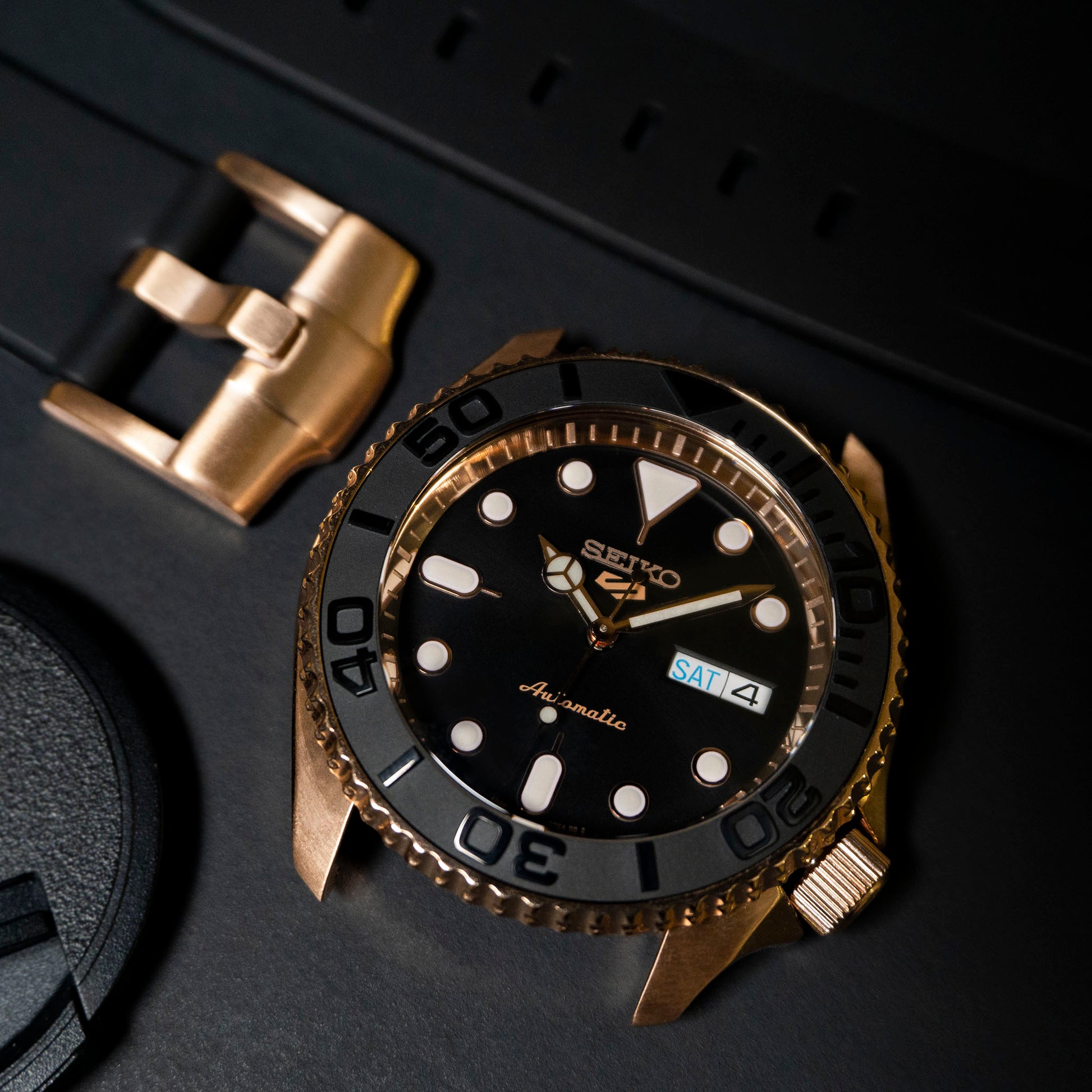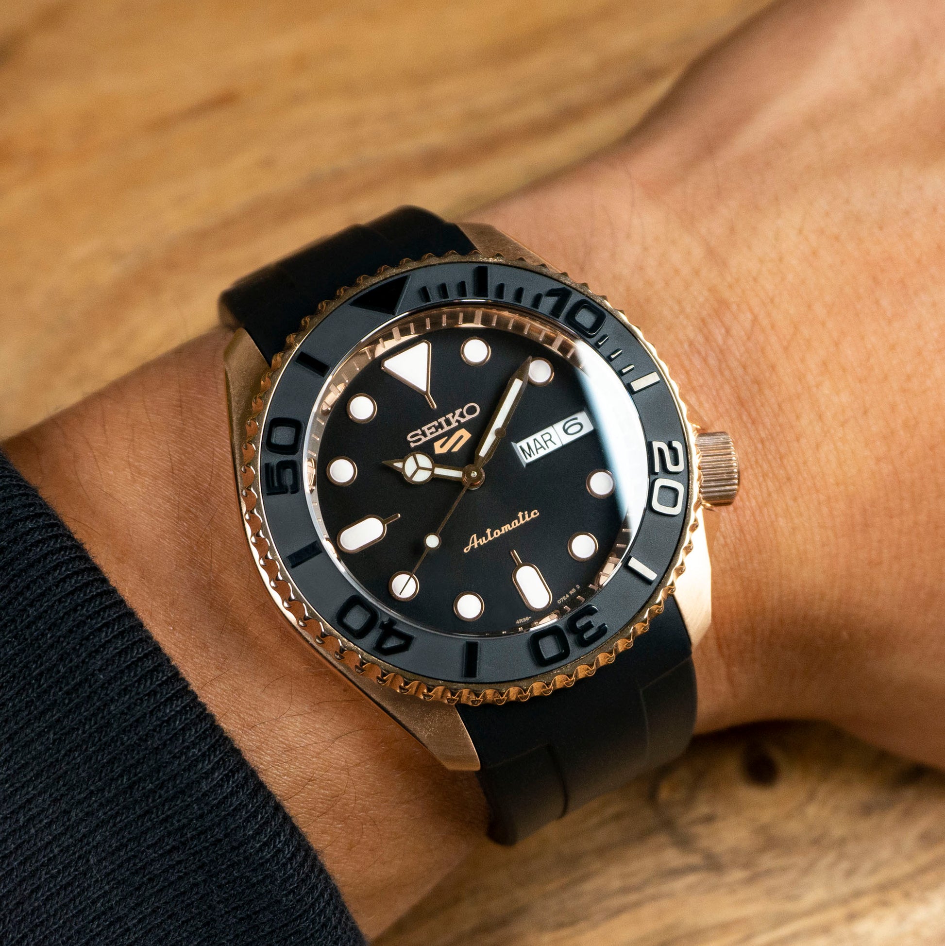 The supple FKM rubber strap offers comfort and versatility, equally at home on deck or at a dockside dinner. Whether you're navigating open waters or charting a course through your day, the Yacht-Master SKX combines Seiko's trusted heritage with a touch of maritime luxury.
